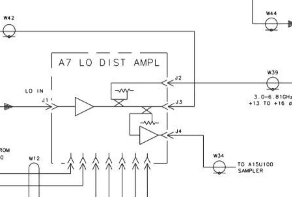 So lets measure the output power on the YTO itself by disconnecting the semirigid cable between the YTO and the LO distribution amplifier. Adding a 10dB attenuator on the YIG and measuring directly reveals +15 dBm which is perfect so the issue must be within the LODA. A quick check on the other outputs on the distribution amplifier shows the same behavior, the mixer output is around -15 dBm, too. The sampler output is at roughly -30 dBm, so 15dB below the mixer level, it should be around 0 dBm.