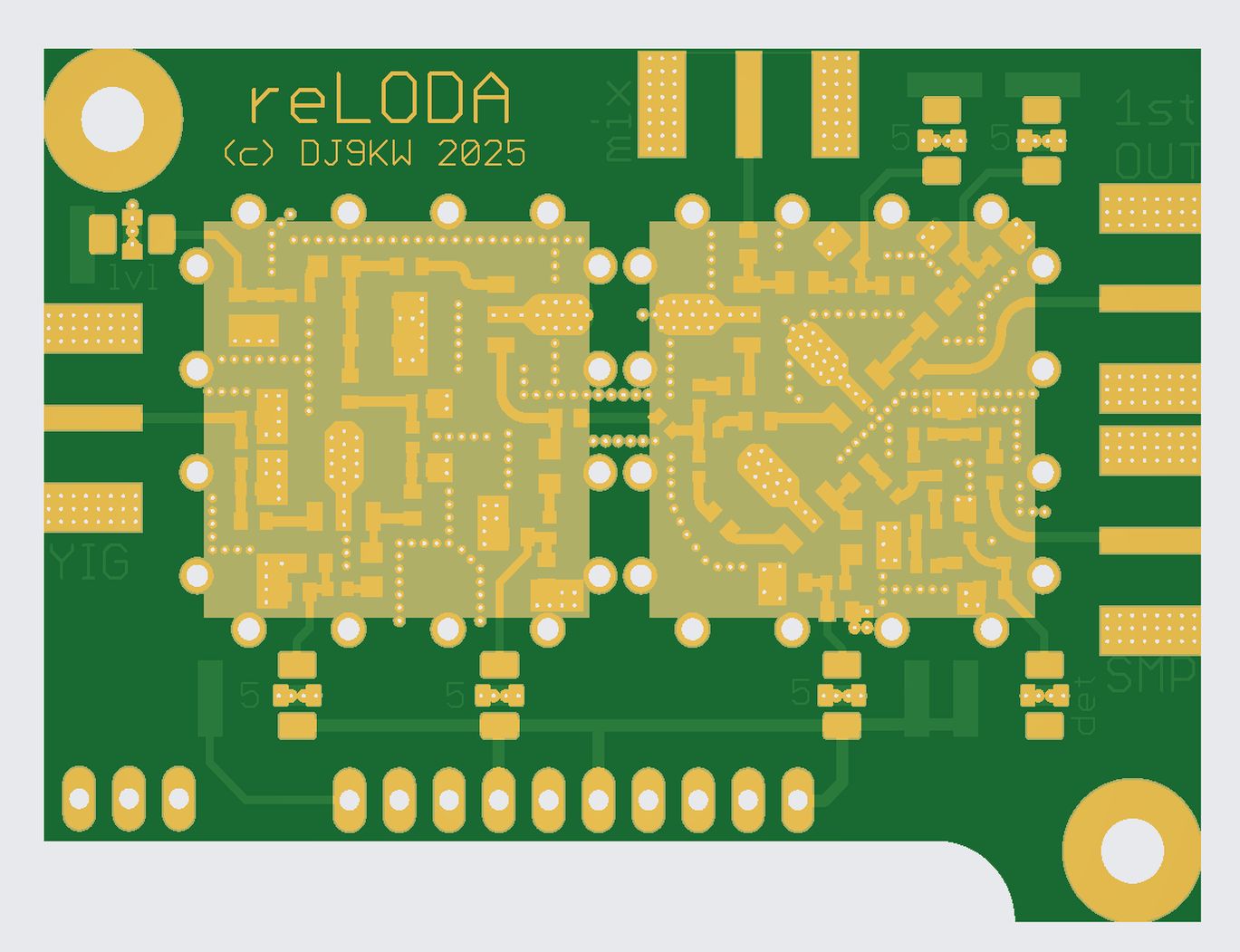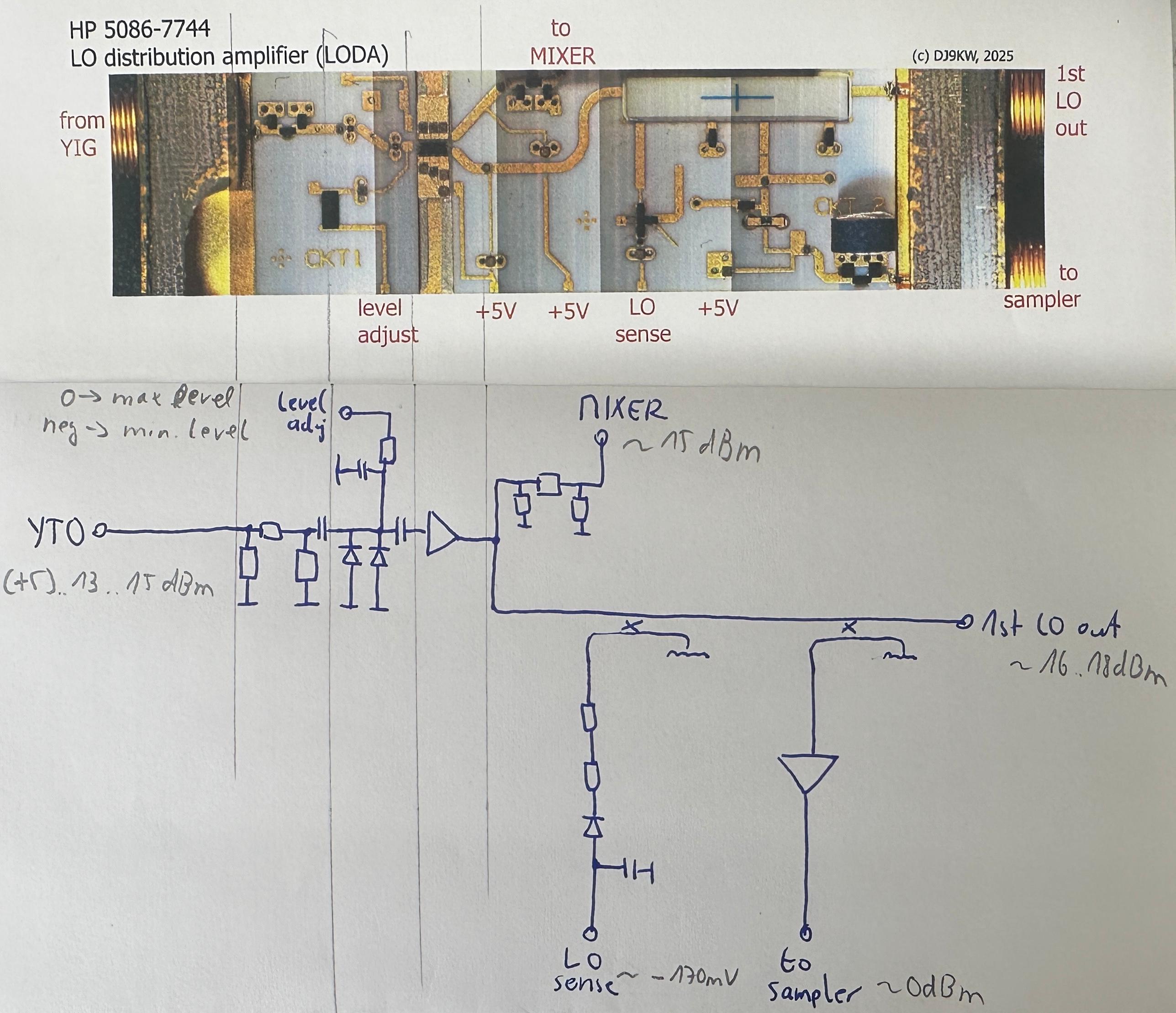 On the left side you can see the input from the YTO. According to the internet, the LODA requires an input level between +5 and +18 dBm to achieve a leveled output. A well behaving YTO should output around +13 to +15 dBm while a slightly tired one is just shy of +11 dBm, so still within the acceptable limits of the LODA (at least by now...).