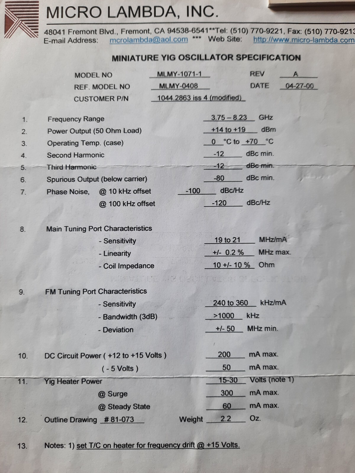 MicroLambda MLMY-1071-1 Yig Tuned Oscillator