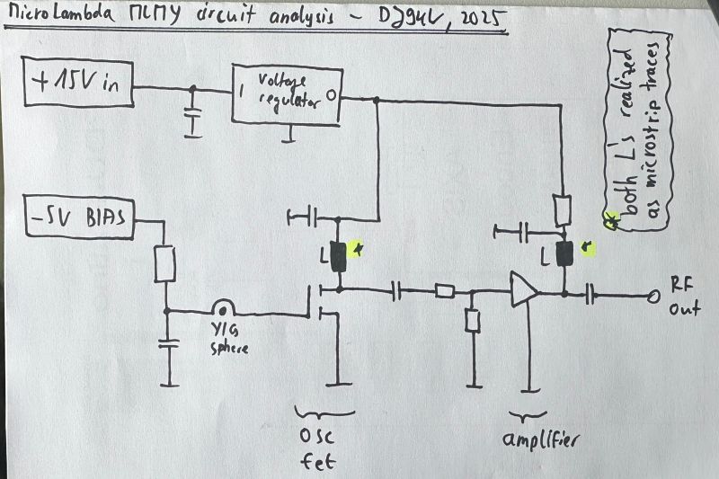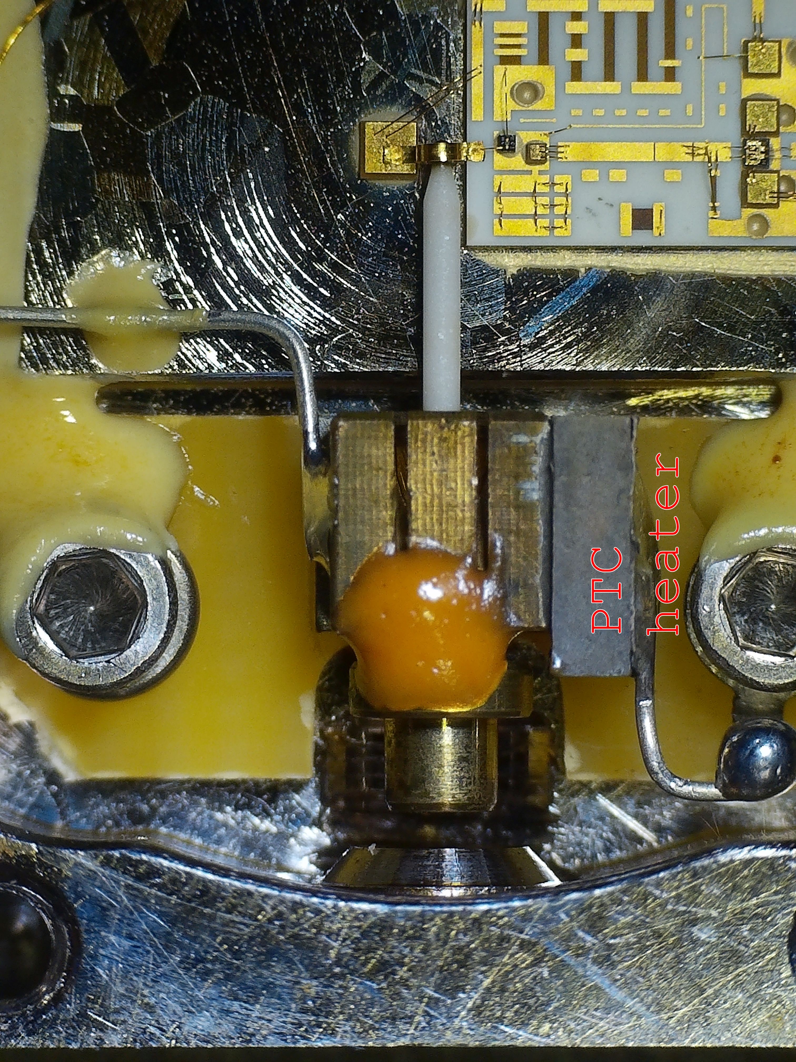 On the bottom left you can see the YIG sphere mounted on its holder. Bottom right you can see the microstrip line going to the rf output.