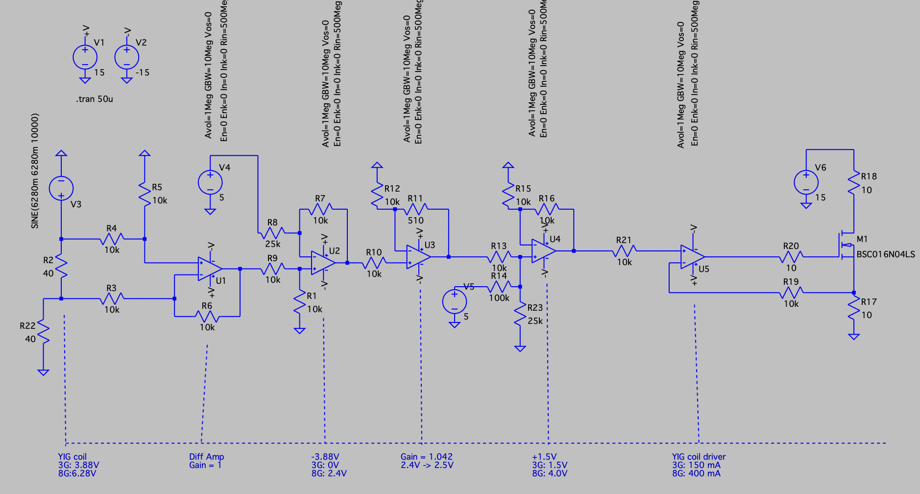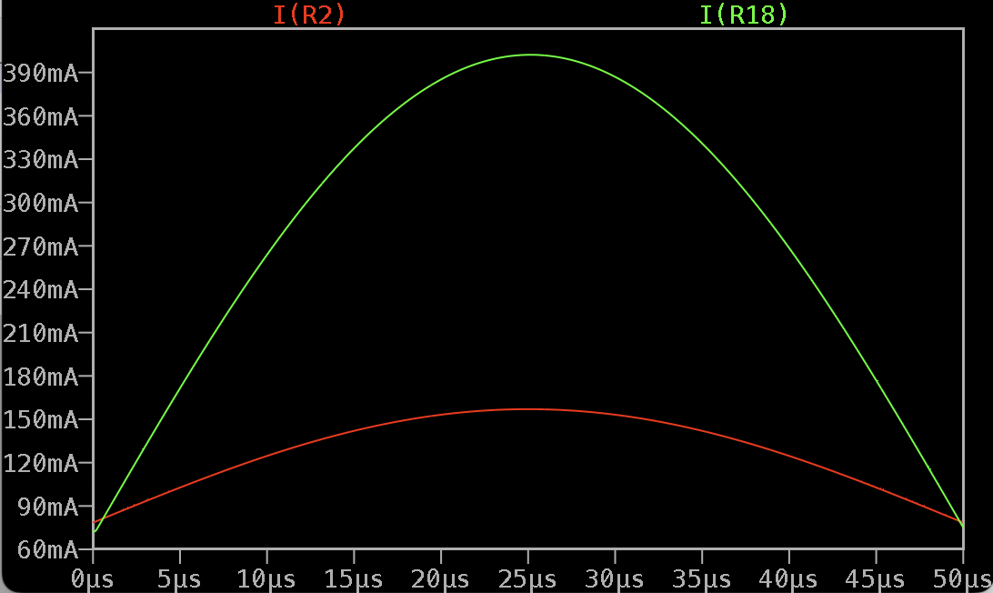 , at least I can't substitute them without further modifications... That's the moment where LTspices comes in handy for rescue! A quick simulation later, I've designed (at least in theory) a circuit which translates the 97 to 150 mA HP tuning coil current (red trace in simulation) to 150 .. 400 mA MLMY tuning coil current (green trace in simulation):