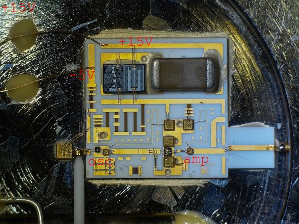 On the left side of the ceramic substrate the connection of the -5V bias for the oscillator transistor is bonded to the substrate. Apparently the bias is only required for the oscillator transistor, not for the amplifier.