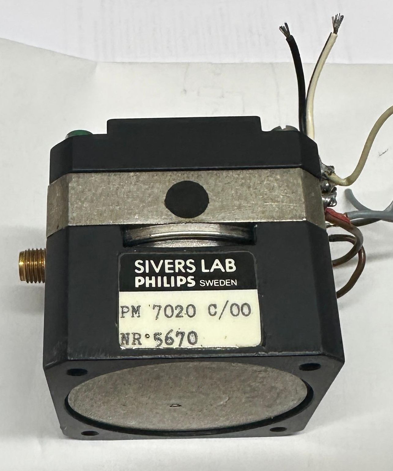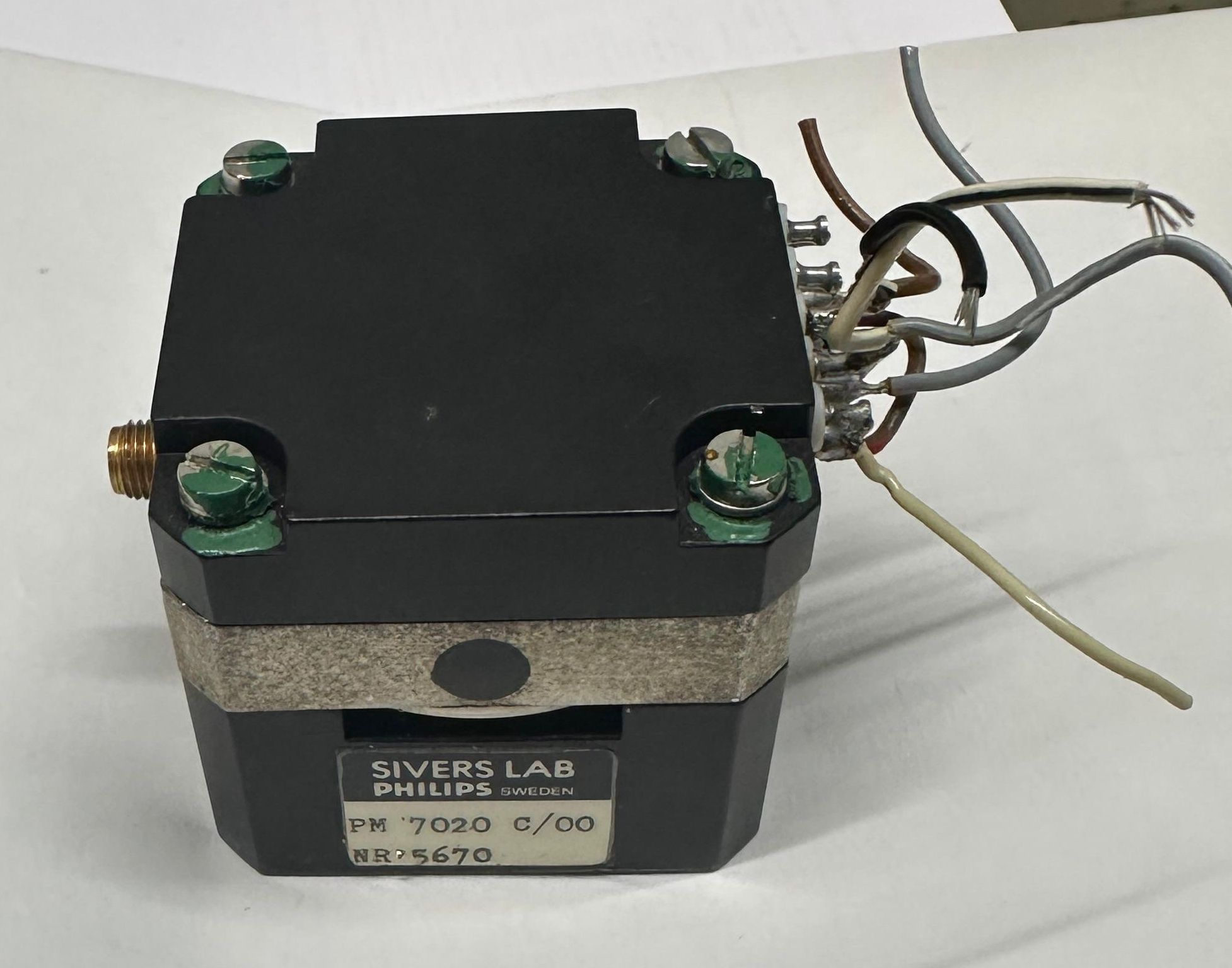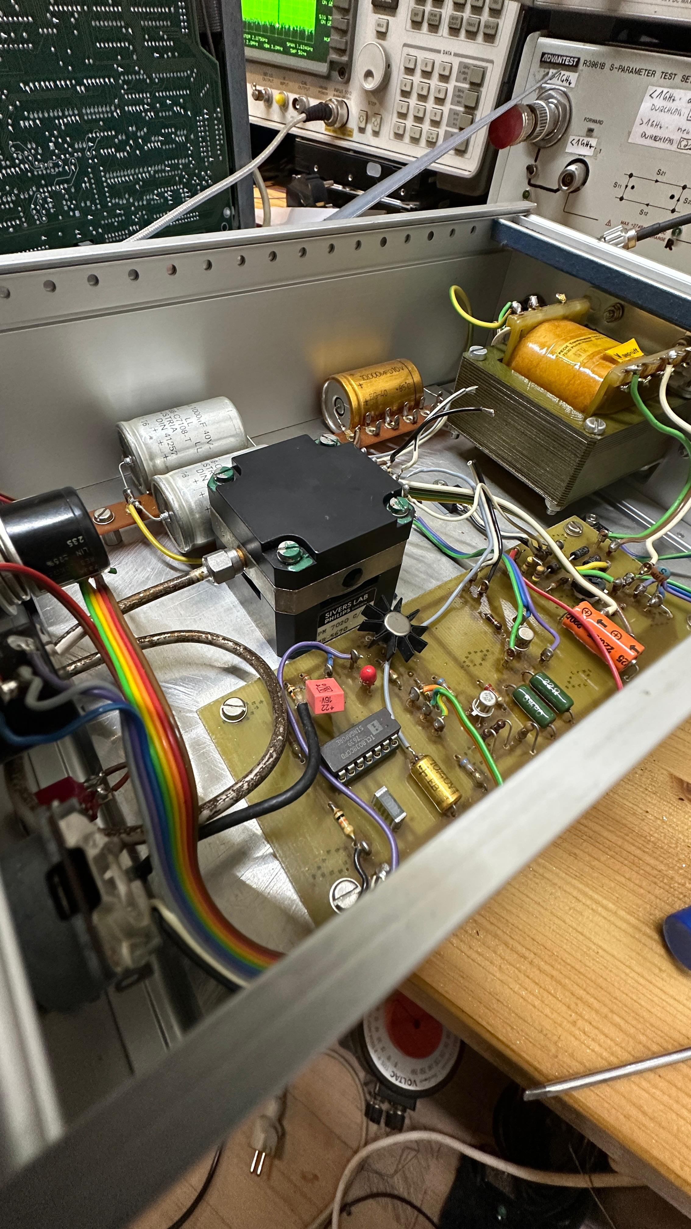 Digging through my stash looking for potential "organ donors" for my HP spectrum analyzers, I stumbled across a handmade box built by a former colleague. Hmm, my handwriting says "2,1 to 8,3 GHz Yig Oscillator" on its top, a good opportunity to test it with my recently repaired HP 8562A spectrum analyzer! Et voilą, it oscillates! Curious to see what's inside, I open the box and I'm greeted by a yig tuned oscillator built by Philips / Sivers Lab. Its part number is "PM7020".
